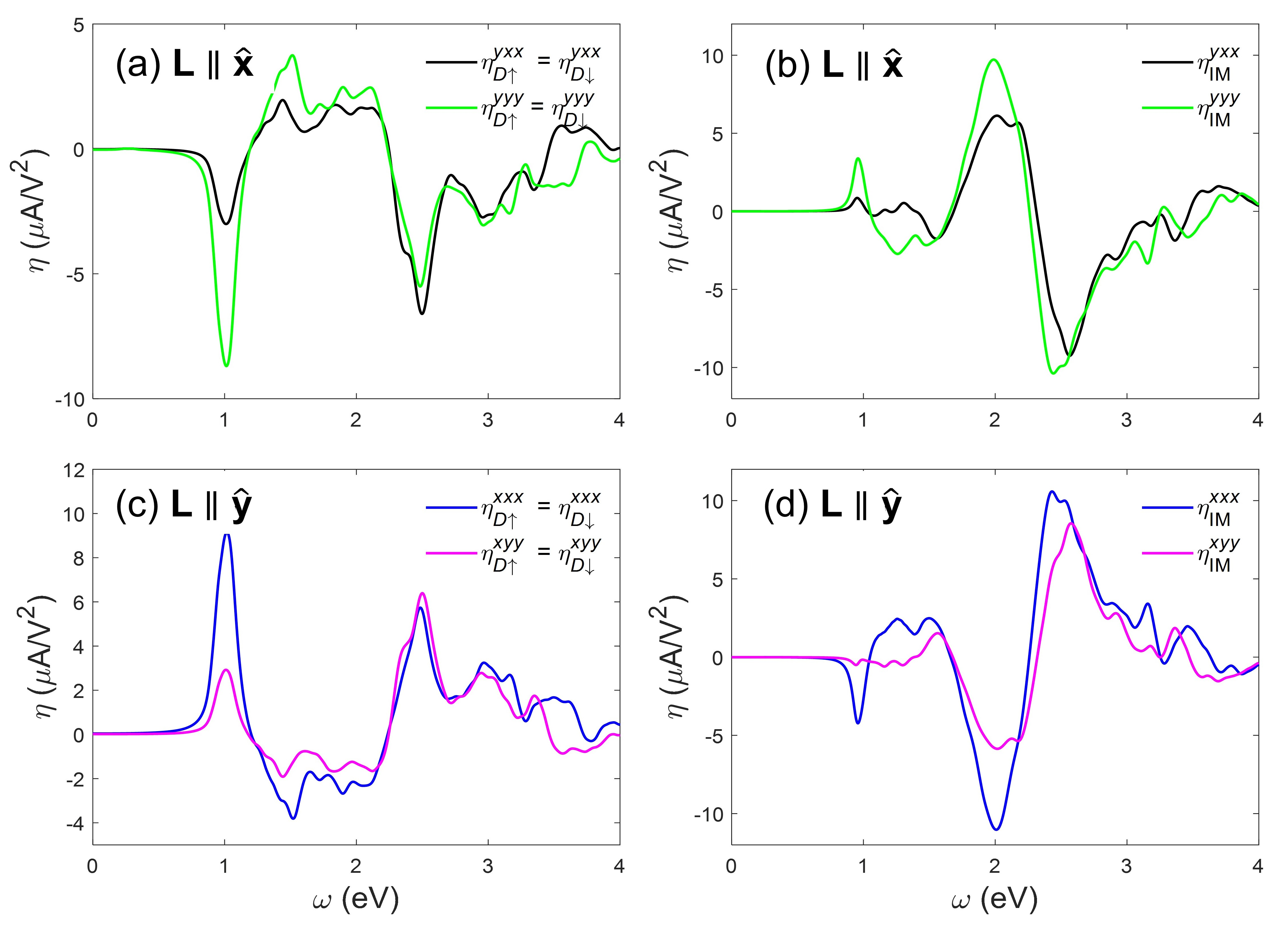 最近,研究发现在磁性体系中,体光伏效应产生额外的磁性项,磁性移位电流(magnetic shift current)和磁性注入电流(magnetic injection current)。在线偏振光照射下,磁性体系中通常会同时存在普通移位电流(normal shift current)和磁性注入电流。因此为了探究磁性体系中体光伏效应的可调控性,人们可以借助于自旋甚至自旋和电极化自由度的共同作用调控体系对称性。